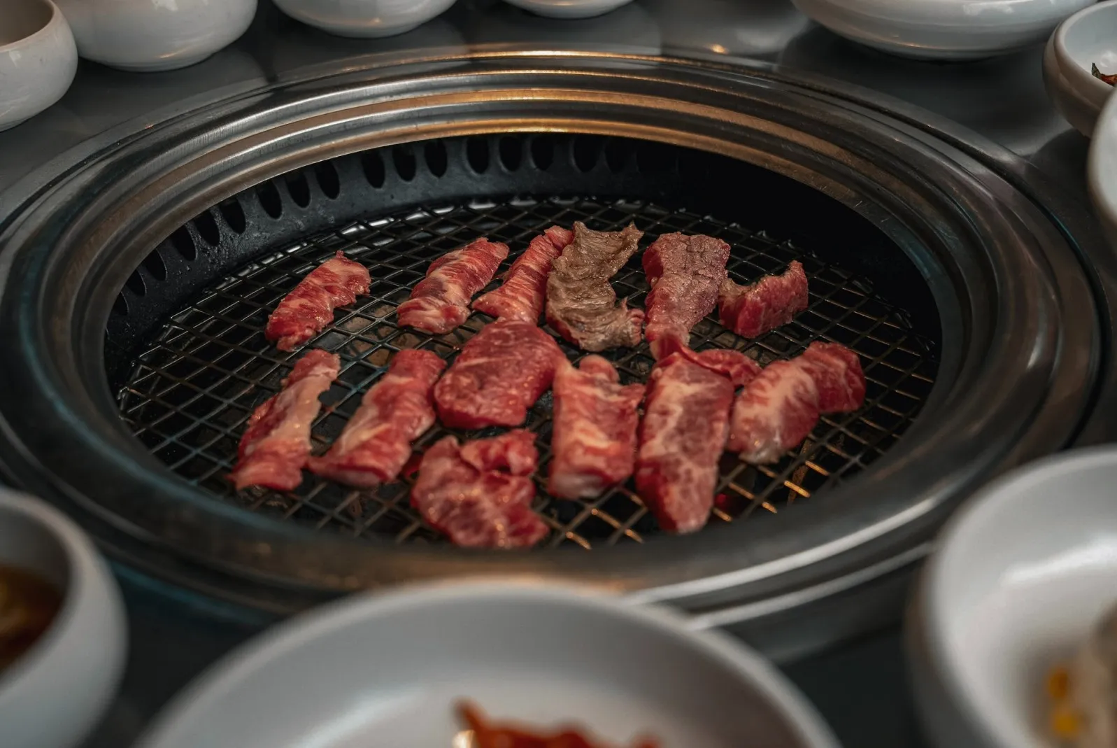 You will be seated at a table with a built-in grill, you choose your meats, once the waiter takes your order they will bring you down a variety of side dishes called banchan that will be placed in the middle of the table to share. Banchan is different in each restaurant so you never know what you are going to get, usually it is 5 – 7 dishes of kimchi, japchae, namul, and dubu jori. Each dish is distinct and compliments the meats, you can typically ask for a refill. Condiments like pepper, gochujang and oil will also be placed on your table.